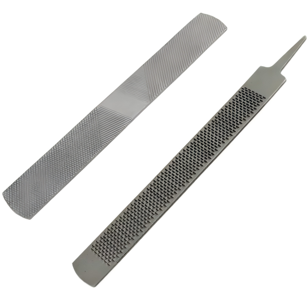 The hoof rasp has two sides, one side with wooden teeth and one side with fitter teeth.